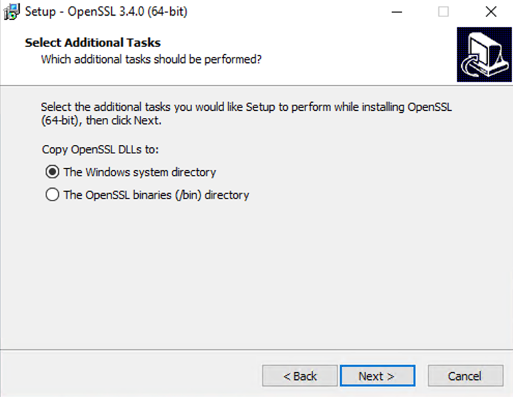 C:\Program Files\OpenSSL-Win64\). - Na opção "Copy OpenSSL DLLs to:", escolha: