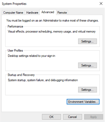 Win + R, digitesysdm.cple pressione Enter. - Vá até a aba Avançado e clique em Variáveis de Ambiente.